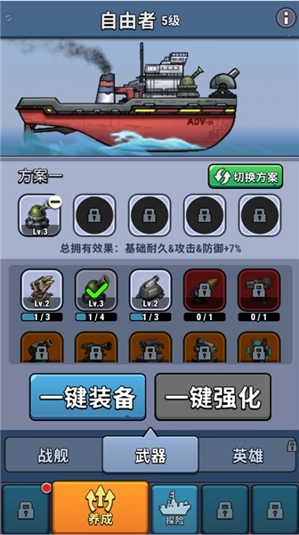战舰能够配备各式各样的武器与防具,以此增强自身的战斗力。并且,每一艘战舰都拥有独特的技能,通过对技能进行升级能够强化技能的效果。需要留意的是,在战斗开始之前,要依据敌人的特性挑选出恰当的技能和装备。
