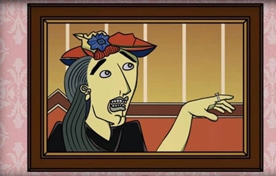 3、接着向右移动进入新场景,取走画框左下角的「红色便签」和右侧窗帘上方的「蓝色便签」。