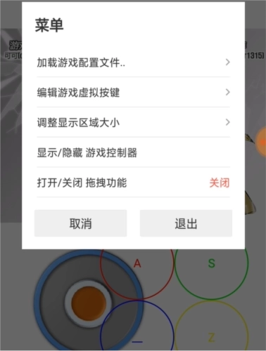 4.按下手机的返回键会弹出如下菜单,通过该菜单既能够对游戏内的虚拟按键进行编辑,也可以将手柄隐藏起来。
