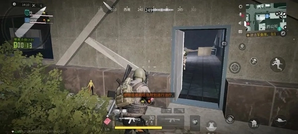 医药公司大楼的每层楼都设有这种墙沿,要是敌人追击你,你可以躲到窗户外侧的墙沿上对其进行偷袭。不过要留意身后高处是否有狙击人机,以及地面是否有人机;楼内若有人机离你较近,也会直接瞄准你,这样你就会暴露位置,所以可以先把这些人机清除掉。