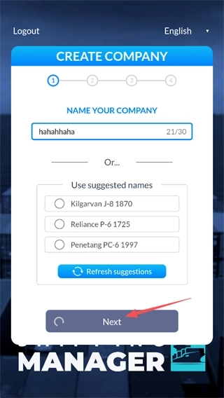 1、游戏开始时,先设定好自己航运公司的名称,接着点击“NEXT”按钮。