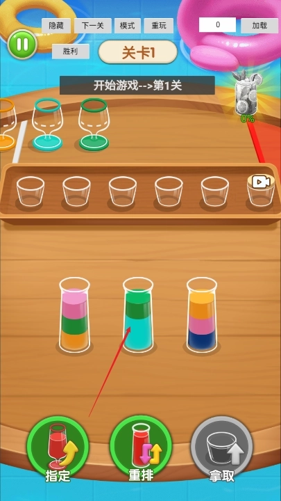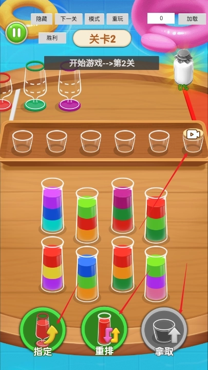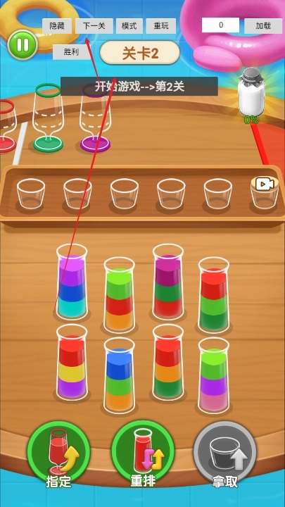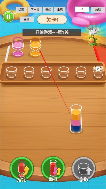 1、玩家需点击不同试管,把相同颜色的液体倒进指定杯子,每个关卡的液体颜色与试管编号均不相同。